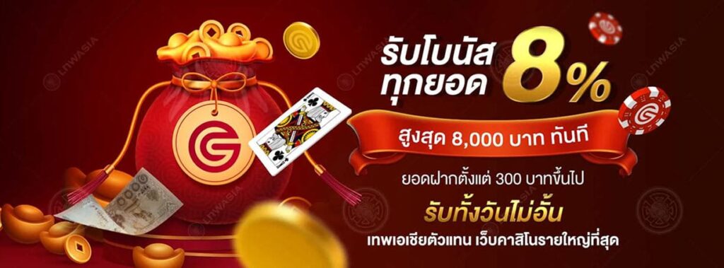 รับโบนัส 8% สูงสุด 8,000 บาททันที!! ทุกยอดฝาก ตั้งแต่ 300 ขึ้นไป (รับทั้งวันไม่อั้น)